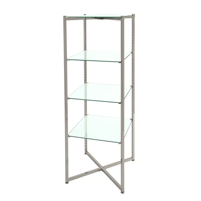 Folding Glass Towers folds easy for set up or storage. Includes 4 tempered glass shelves. Special clips hold 3/16″ thick tempered glass shelf securely. Fully slotted on inside for shelf adjustability every 1″. Includes levelers.