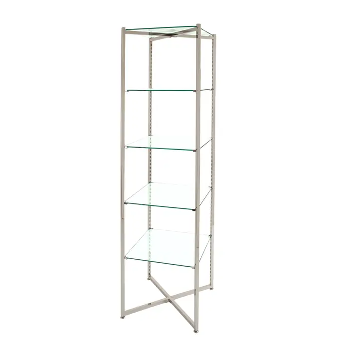 Folding Glass Towers folds easy for set up or storage. Includes 5 tempered glass shelves. Special clips hold 3/16″ thick tempered glass shelf securely. Fully slotted on inside for shelf adjustability every 1″. Includes levelers.