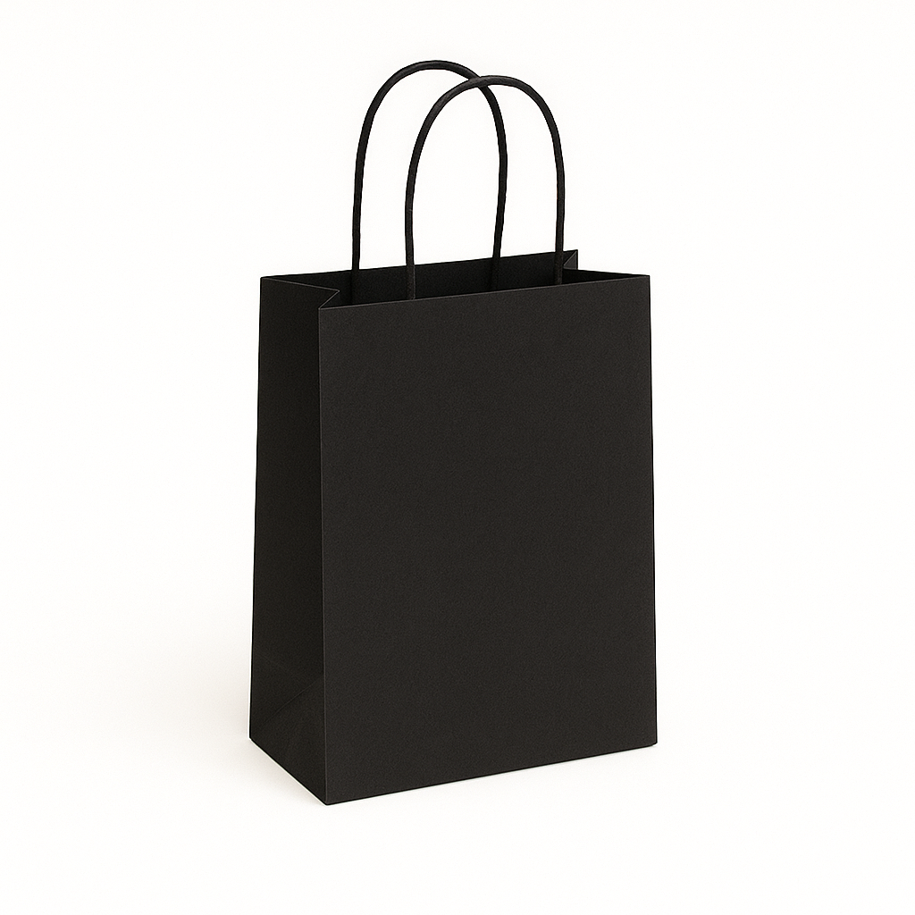 Black Kraft bag with twisted paper handle (Paper handle is white) Size: 8″ X 5″ X 10″ 200pcs per case
