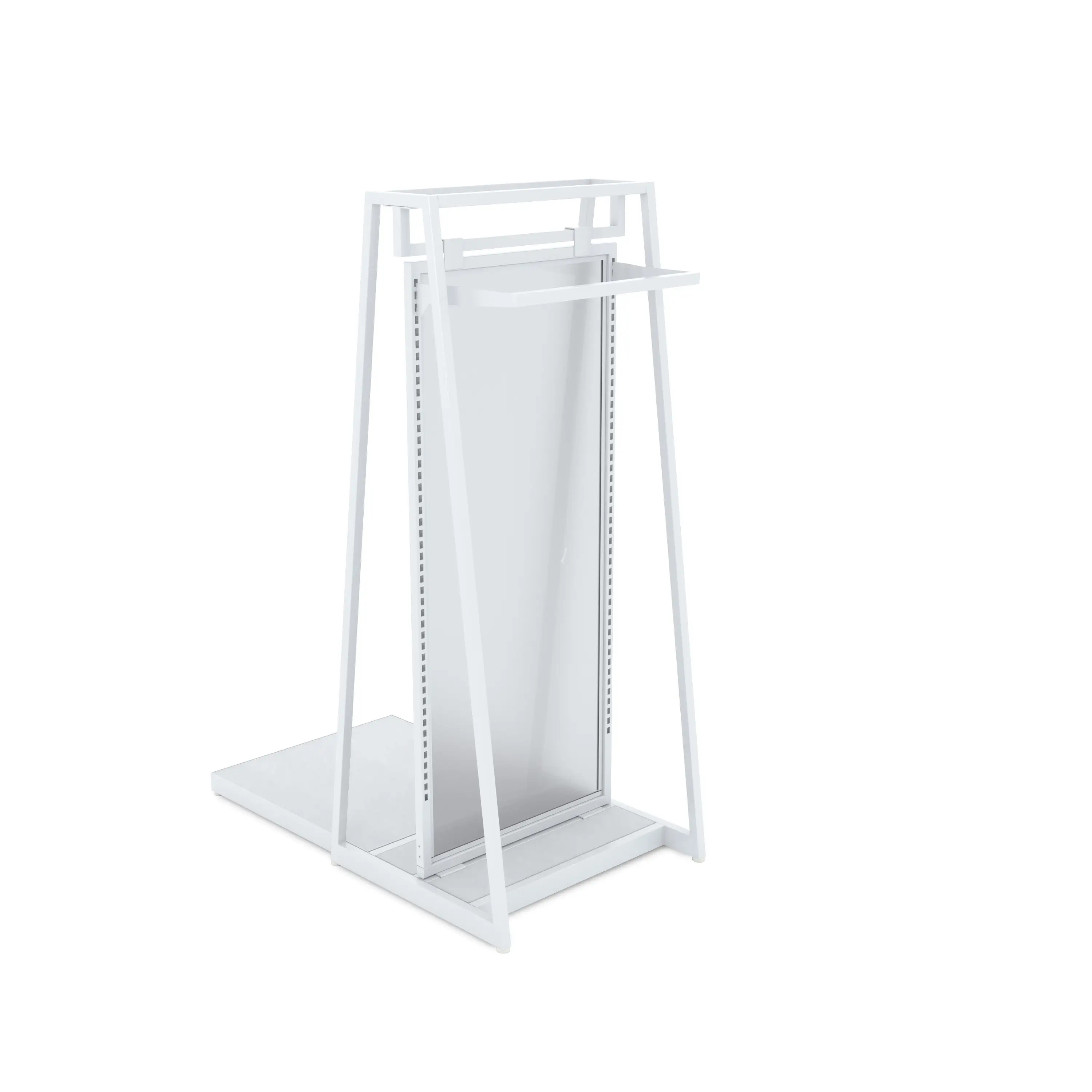 The Gloss White finish of the Aspect 24″ Floor Merchandiser Kit 5 makes it an ideal choice for retail sales environments. This versatile garment display unit is designed for hanging apparel on one side, while the other side features a mannequin platform to showcase a fully dressed mannequin. Utilizing mannequins to display apparel can significantly boost sales and speed up inventory turnover. The hangrail measures 22-7/8″ wide, providing 21-1/4″ of hanging space due to the offset brackets. The bar extends 11″ deep from the back of the bracket and is made from durable 1″ square tubing. The mannequin platform, measuring 23-17/32″ W x 25-9/16″ L x 2″ H, fits snugly between the merchandiser’s A-frame and includes a sturdy metal frame with a wood panel insert. To complete your display, we offer a variety of in-stock mannequins, each sold separately. The overall dimensions of the merchandiser are 62″ high x 24″ wide x 24″ long, making it a compact yet highly functional display unit for retail sales environment.