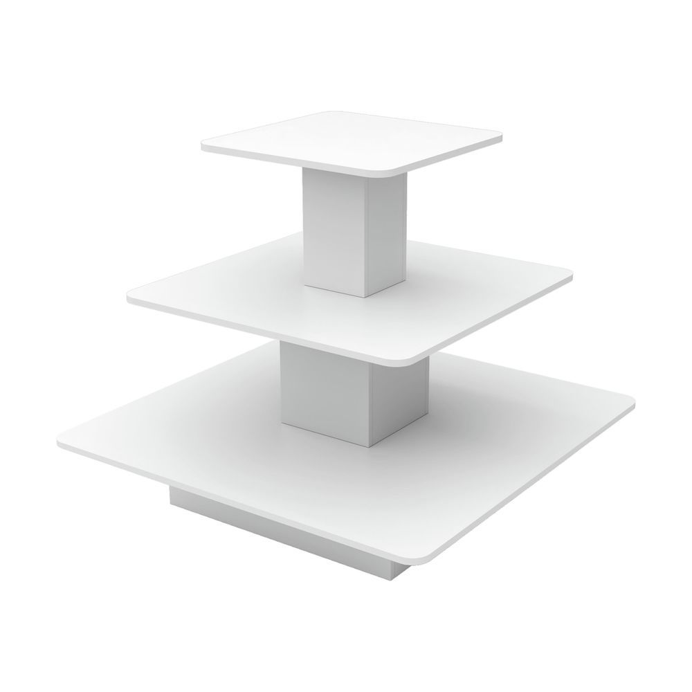 3-Tier Square Table has a footprint of 48″Square x 42″ high. The bottom shelf measures: 48″ x 48″. The middle shelf measures: 36″ x 36″ and the top shelf measures: 24″ x 24″.