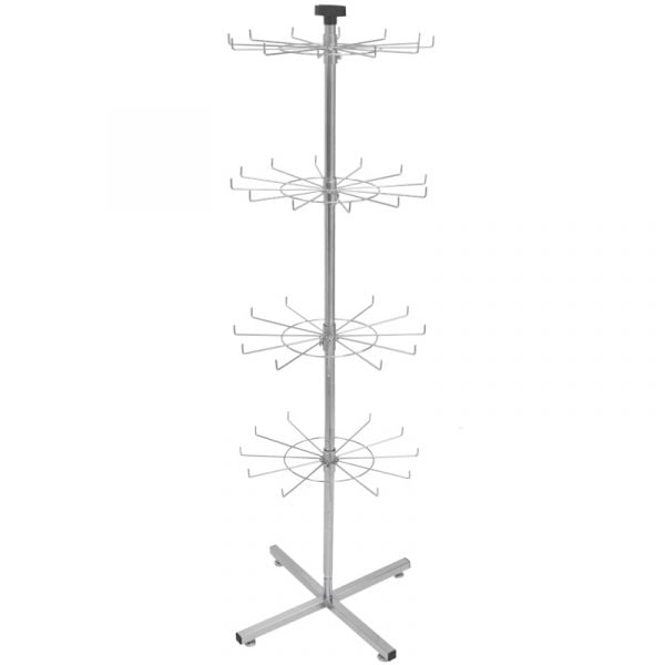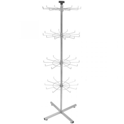 Adjustable levels 23″ Chrome base 63″ Tall Each hook is 4.5″ long from outter brim Top sign holder