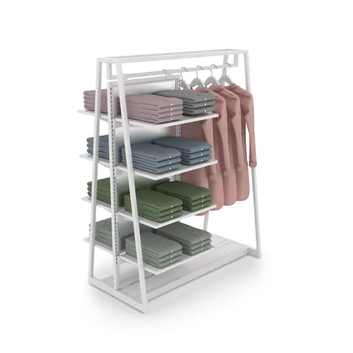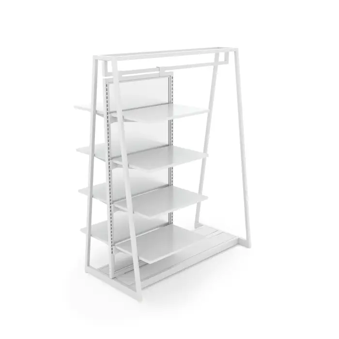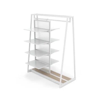 The Aspect 48″ Floor Merchandiser Kit 2 is a traditional floor display merchandiser that offers the flexibility to showcase both hanging apparel and inventory on shelving. Your hanging inventory benefits from approximately 24 inches of hanging length. The eight metal shelves are perfect for displaying matching accessories or hard goods. The Gloss White Aspect floor merchandiser features wooden inserts in the base. The wood has white melamine on one side and a warm raw oak woodgrain on the other, allowing you to create a different look when setting up your displays. This kit includes the 48-inch floor merchandiser, one frosted center panel, and eight metal shelves. The center panel has vertical slots, enabling the shelves to adjust in height. The shelves have welded brackets and measure 21¾ inches wide x 14 inches deep x ¾ inch thick.