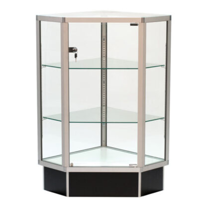 Our extra vision corner filler offers three levels of display space and more glass display. Showcase features a tempered glass top, front and sides, customers can get a good look at the merchandise they are thinking about purchasing. Additional features include two rows of adjustable glass shelves, front swing door with lock, white deck, steel interior standards and shelf brackets.