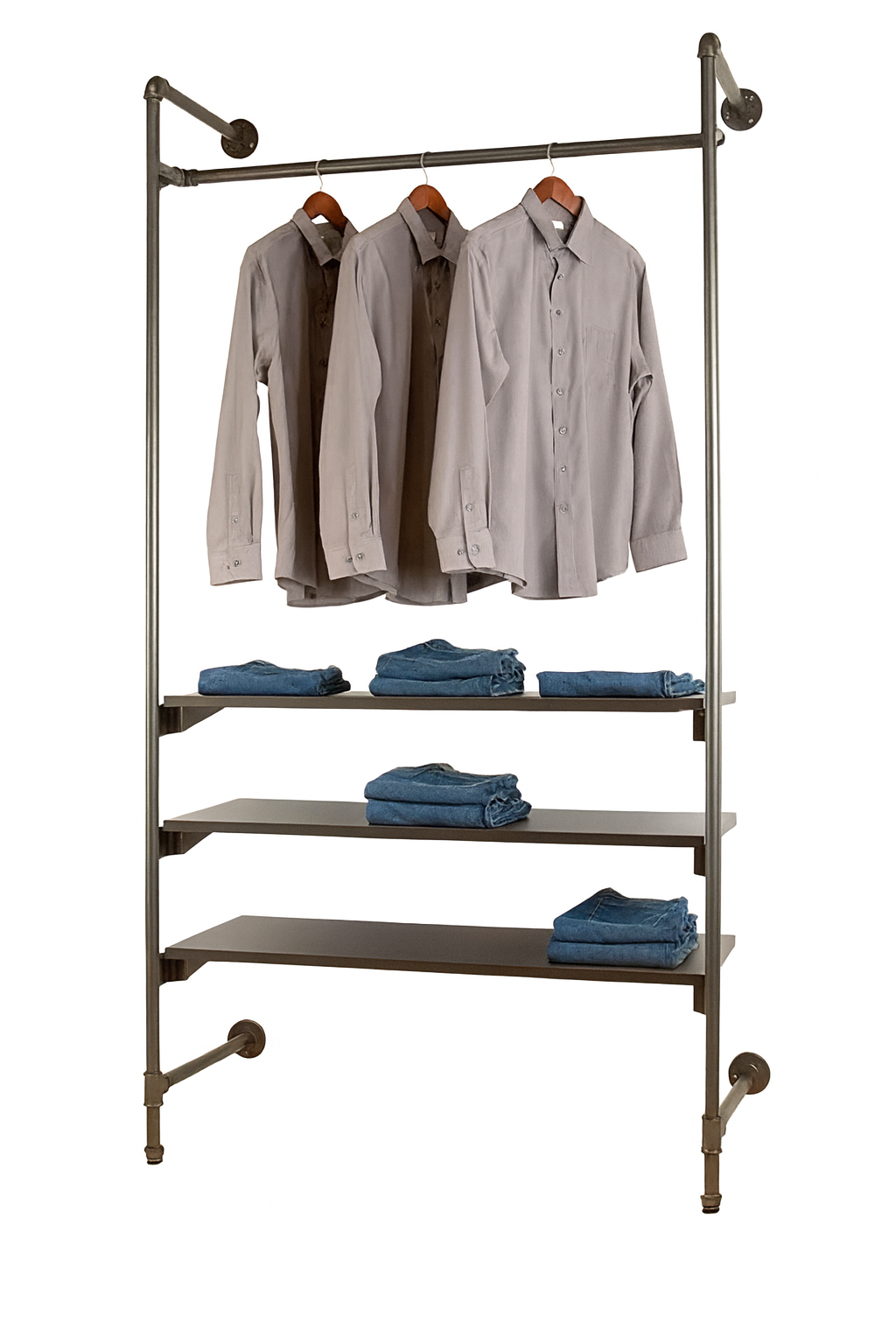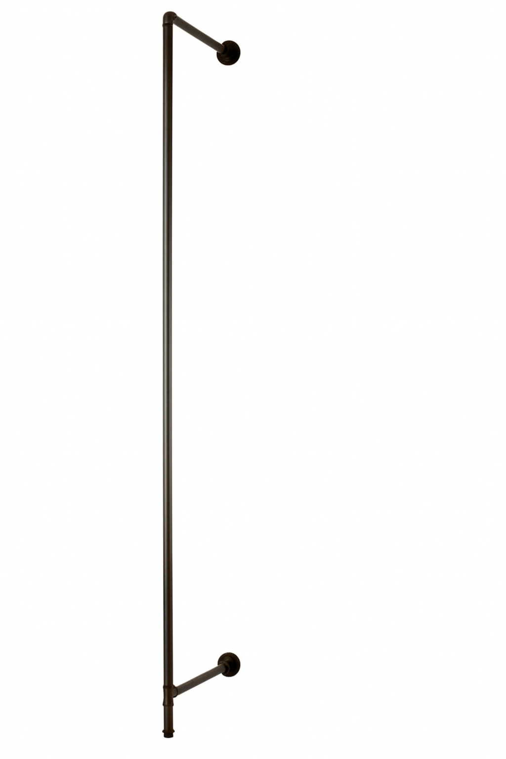 Pipeline Outrigger Wall Unit allows retailers to fully utilize every inch of selling floor space. This Outrigger features½” Slots on 1″ centers. The unit also includes mounting flanges and floor levelers. Constructed from 1¼” diameter plumbing pipe, for years of service, the outrigger has an attractive and trendy anthracite grey finish. This 8-foot tall outrigger is versatile: its lower attachment adjusts to permit mounting the unit over existing floor mouldings. The unit also extends approximately 18″ from the wall to the back of the upright.