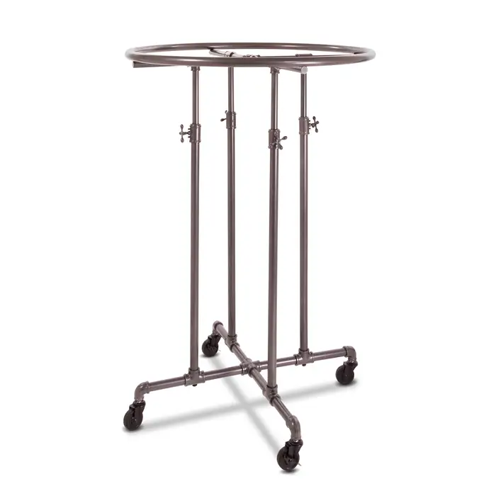 The Pipeline collection is a uniquely designed merchandising collection based on the traditional industrial grade clothing racks popularized in New York’s garment center. This stylized and refined version incorporates interconnecting plumbing pipes and various plumbing connectors. The circular hangrail is adjustable from 45″ to 67″ high and allows retailers to display a sizeable amount of merchandise within a very compact footprint on their selling floor- 26″ x 26″. The uprights and hangrail are made of 1ΒΌ”pipe with four 3″ casters, two that lock. In addition, the unit comes with four rubber-tipped shelf supports.